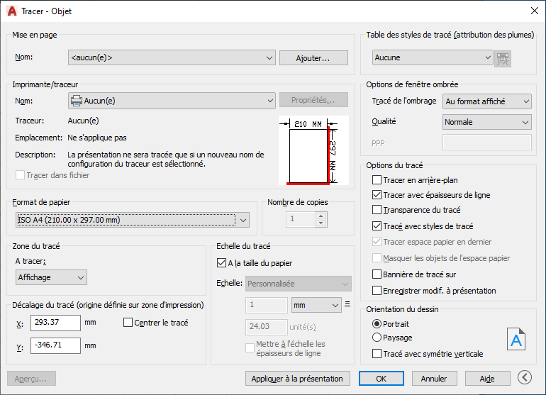 Gère la taille relative des unités de dessin par rapport aux unités tracées. Par défaut, les présentations sont tracées à l'échelle 1:1. Le paramètre par défaut est A la taille du papier pour le traçage depuis l'onglet Objet.