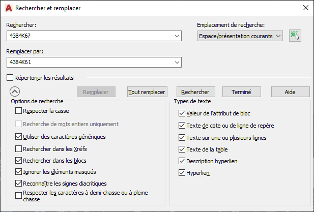 Par exemple, si vous disposez de plusieurs pièces similaires dans votre dessin et que vous devez toutes les modifier sur 4384K61, entrez 4384K6? dans le champ Rechercher et 4384K61 dans la zone Remplacer par.