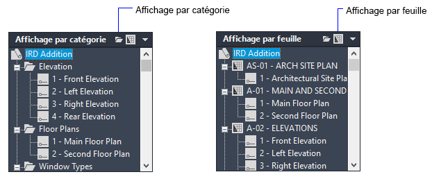 Dans l'onglet Liste des feuilles, les feuilles peuvent être organisées en groupes nommés sous-jeux. Dans l'onglet Vues des feuilles, les vues peuvent être organisées en groupes nommés catégories.