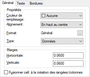 Gère l'espacement entre la bordure de la cellule et le contenu de la cellule. Les paramètres de marge de cellule s'appliquent à toutes les cellules du tableau. Le paramètre par défaut est de 0.06 (système anglo-saxon) et de 1.5 (système métrique).