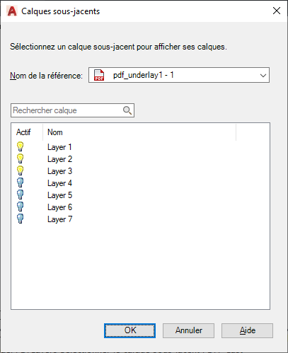 Utilisez la commande CALQUESDWF, CALQUESPDF, CALQDGN ou CALQUESJ, ou cliquez avec le bouton droit de la souris sur un calque sous-jacent sélectionné et choisissez Calques dans le menu contextuel.