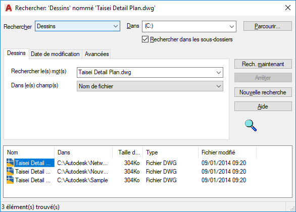 Indique le type de contenu à rechercher. Le type de contenu spécifié détermine les onglets affichés dans la boîte de dialogue Rechercher, ainsi que les champs de recherche proposés. Les onglets Date de modification et Avancées s'affichent uniquement si vous sélectionnez l'option Dessins dans la zone Rechercher.