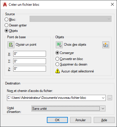 Convertit le ou les objets sélectionnés en bloc dans le dessin courant après leur enregistrement en tant que fichier.