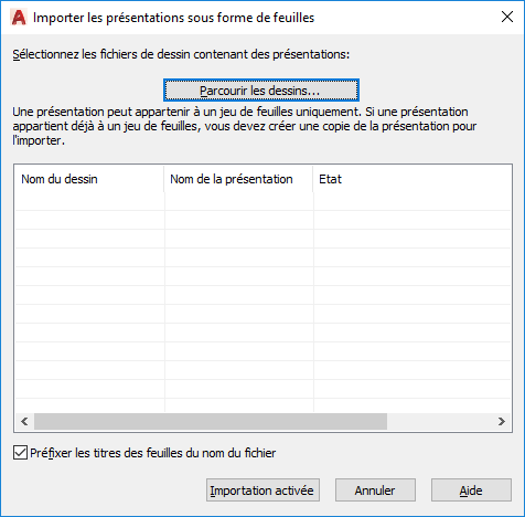 Si une présentation appartient déjà à un jeu de feuilles, vous devez créer une copie du dessin contenant la présentation en vue de l'importer.