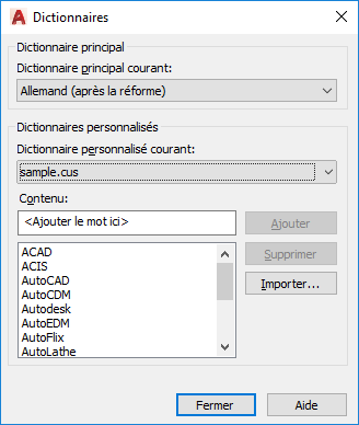 Affiche le nom du dictionnaire personnalisé courant. L'extension .cus est utilisée pour le dictionnaire personnalisé d'AutoCAD.