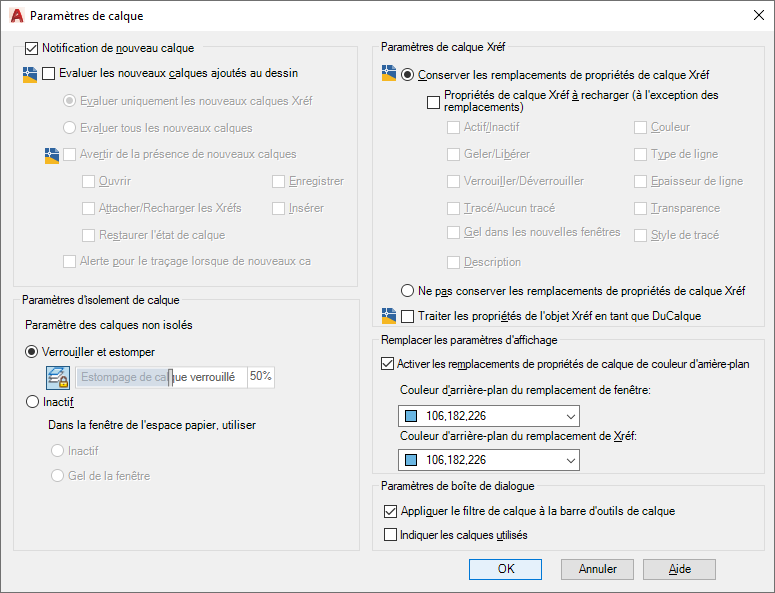 Contrôle l'affichage des remplacements de propriétés de calques xréf dans votre dessin actuel.