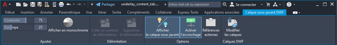Onglet contextuel du ruban Calque sous-jacent DWF