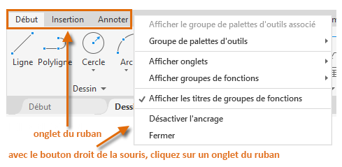 - Cliquez sur la barre de titre, puis faites glisser le ruban sur le bord gauche, droit ou supérieur de la zone de dessin