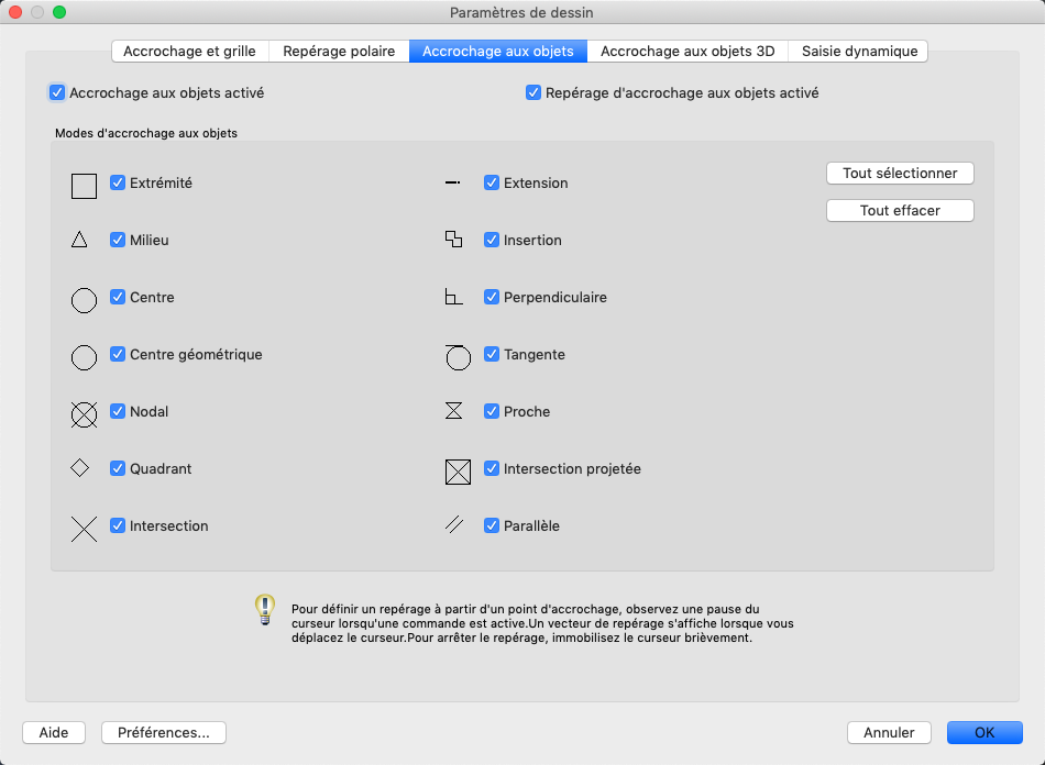 Dresse la liste des accrochages aux objets que vous pouvez activer sous forme d'accrochages aux objets actifs.