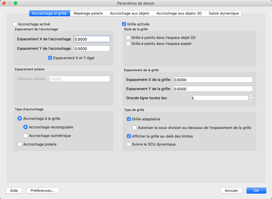 Contrôle une grille rectangulaire invisible d'emplacements d'accrochage qui restreint le mouvement du curseur selon les intervalles X et Y spécifiés.