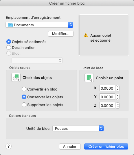 La boîte de dialogue Créer un fichier bloc affiche des paramètres par défaut qui diffèrent en fonction des situations suivantes : vous n'avez rien sélectionné, vous avez sélectionné un objet, l'objet sélectionné est un bloc unique ou vous avez sélectionné des objets autres que des blocs.