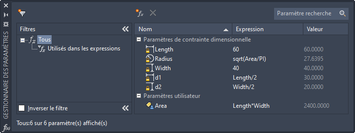Les paramètres de contraintes dimensionnelles Longueur et Largeur sont définis sur des constantes. Les contraintes d1 et d2 sont des expressions simples qui référencent Longueur et Largeur. Le paramètre de contrainte dimensionnelle Rayon est défini sur une expression qui inclut la fonction racine carrée, des parenthèses pour déterminer la priorité des opérations, la variable utilisateur Aire, l'opérateur de division et la constante PI. Ces paramètres sont disponibles dans le gestionnaire des paramètres.