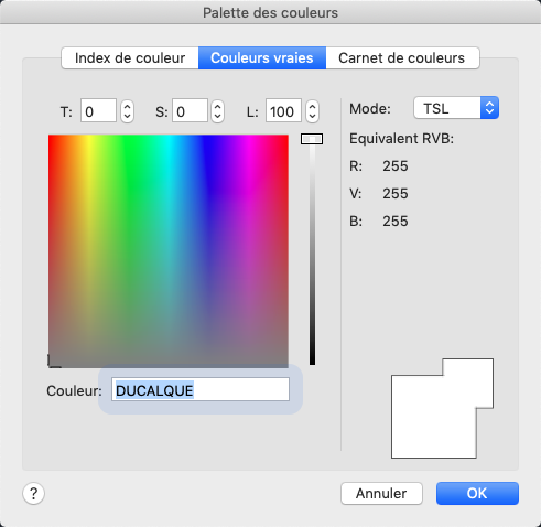 Spécifie le modèle de couleurs RVB pour la sélection des couleurs. Les options disponibles dans l'onglet Couleurs vraies dépendent du modèle de couleurs indiqué : TSL ou RVB.