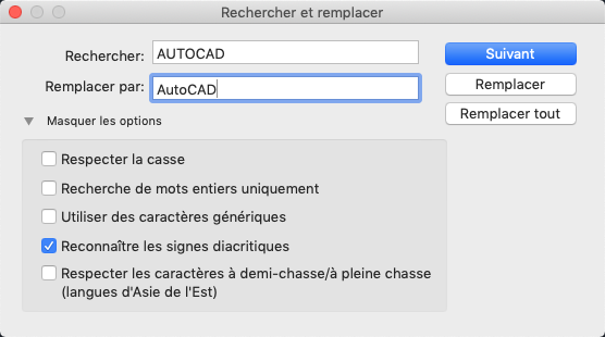 La casse de tous les caractères de la chaîne de texte doit correspondre à la casse du texte indiqué dans Rechercher. Lorsque cette option est désactivée, le programme recherche les chaînes correspondant à celle spécifiée sans tenir compte de la casse.