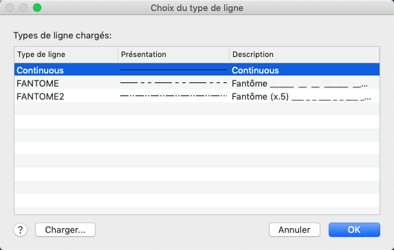 Affiche la liste des types de ligne chargés dans le dessin courant.