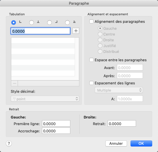 Affiche les options de définition des tabulation, y compris pour ajouter et supprimer des tabulations. Les options comprennent les tabulations gauche, centre, droite et décimales. Vous pouvez également définir les tabulations avec le bouton de sélection des tabulations sur la règle de l'éditeur de texte sur place.