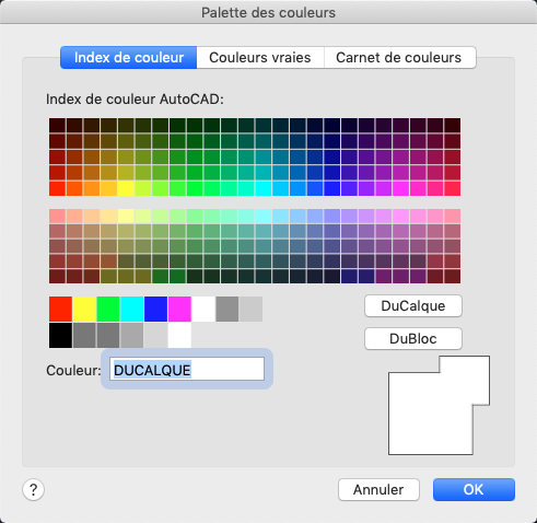 Indique un nom de couleur, une couleur DUCALQUE ou DUBLOC, ou un numéro d'index des couleurs AutoCAD (ACI) compris entre 1 et 255. Le témoin de couleur Nouveau indique la dernière couleur sélectionnée.
