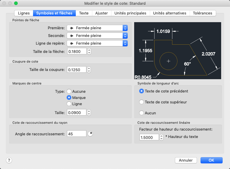 Définit le format et la position des pointes de flèche, des marques centrales, des symboles de longueur d'arc et des cotes radiales raccourcies.