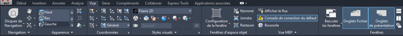 L'onglet Vue permet de définir et modifier les vues et de naviguer dans le dessin depuis un emplacement centralisé.