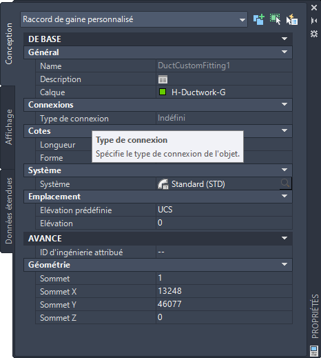 Lorsque vous passez le curseur sur une propriété de la liste figurant dans la palette des propriétés, une info-bulle s'affiche.