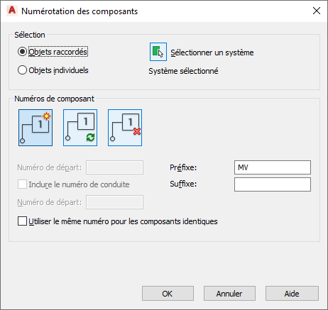 Sélectionnez l'opération de numérotation à effectuer (ajout, mise à jour ou suppression des numéros de composant) en cliquant sur le bouton correspondant.