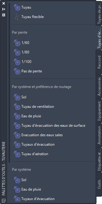 Dans l'espace de travail Tuyauterie, cliquez sur l'onglet Débutgroupe de fonctions Constructionliste déroulante OutilsOutils pour afficher la palette d'outils Tuyauterie.