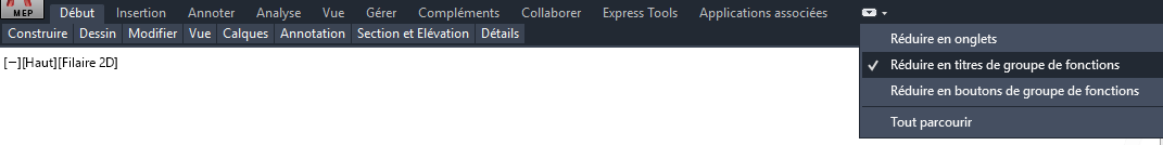 Pour n'afficher que les titres des groupes de fonctions dans les onglets du ruban, cliquez sur (Réduire en titres de groupe de fonctions) dans la partie supérieure droite du ruban.