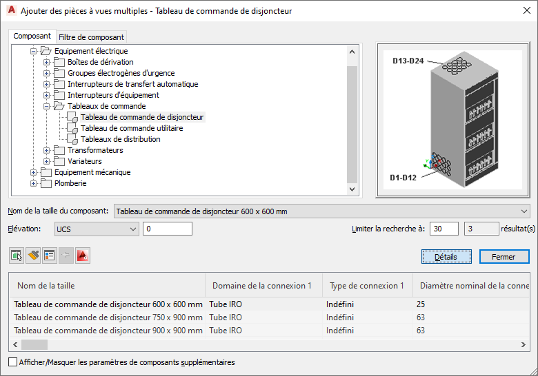 - Cliquez sur Détails pour afficher les tailles disponibles pour le sous-type de composant sélectionné.