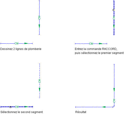 Dans AutoCAD MEP 2022 toolset, la commande RACCORD s'applique aux objets AutoCAD (lignes, polylignes et arcs), mais aussi aux lignes schématiques et aux lignes de plomberie. Avec un rayon de raccord égal à zéro (valeur par défaut), elle permet de relier sans difficulté des lignes schématiques ou des lignes de plomberie par leur ajustement ou leur prolongement. Pour exécuter cette commande, passez en mode orthogonal ou en mode isométrique.