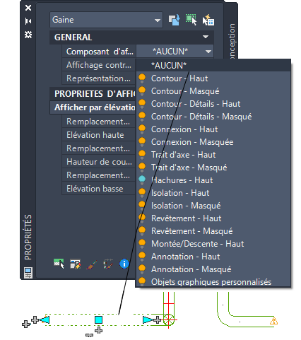 Vous pouvez configurer des composants d'affichage basés sur l'élévation s'appliquant à un objet donné dans le dessin à l'aide de l'onglet Affichage de la palette des propriétés.