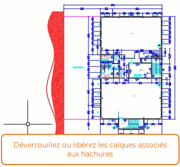 Lorsqu'un objet de hachures se trouve sur un calque verrouillé ou gelé alors que son contour associé est modifié, l'objet de hachures n'est pas mis à jour. Par conséquent, l'objet de hachures ne remplit plus le nouveau contour défini.