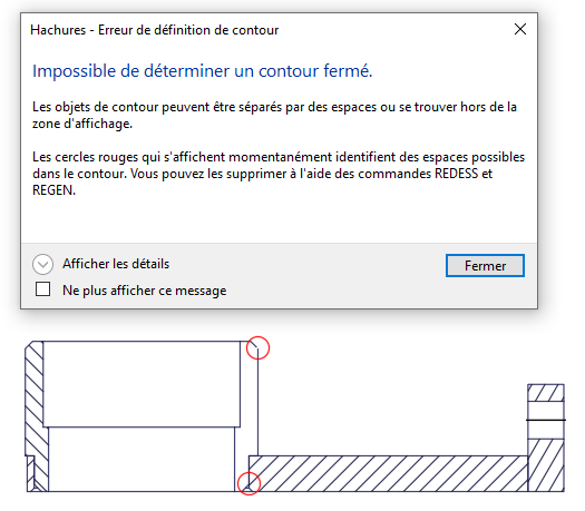 Il peut être frustrant d'être informé qu'un contour de hachures valide n'a pas été trouvé lors de la tentative de création d'un objet de hachures. Voici les raisons les plus courantes expliquant pourquoi un contour de hachures correct est introuvable :