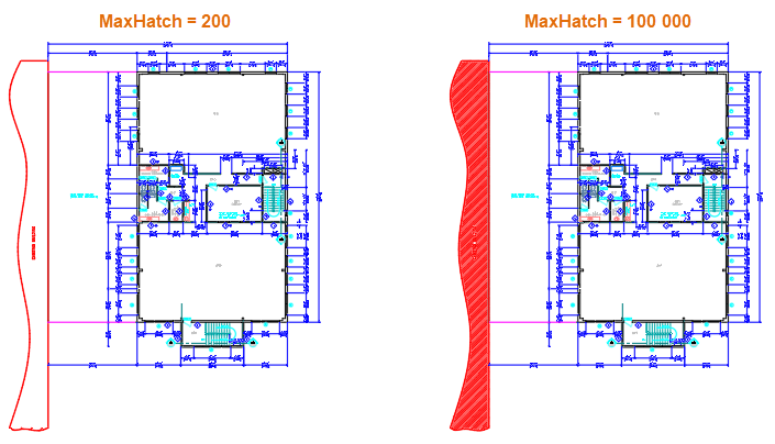 Avez-vous hachuré une zone uniquement pour que le motif ne soit pas affiché ? Si tel est le cas, cela peut être dû à la trop grande densité du motif ou à la taille trop petite des tirets, ce qui peut entraîner un grand nombre de lignes dans le motif. Dans ce cas, vous devrez peut-être ajuster le paramètre d'affichage Hachures maximales ou l'échelle affectée à l'objet de hachures. Par défaut, le paramètre d'affichage Hachures maximales est défini sur 100 000, ce qui est généralement idéal. Toutefois, si vous rencontrez ce problème avec vos dessins, il peut être nécessaire d'augmenter la valeur du paramètre Hachures maximales. Le paramètre Hachures maximales peut être modifié à l'aide de la variable d'environnement MaxHatch.