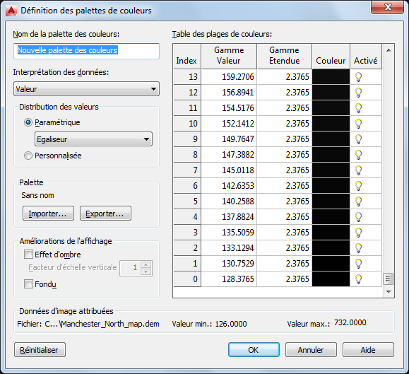 À l'aide de jeu d’outils AutoCAD Raster Design, vous pouvez afficher une surface de terrain DEM avec codage couleur par élévation, degré d'inclinaison ou aspect (direction d'inclinaison). Dans la boîte de dialogue Définition des palettes de couleurs, spécifiez les attributs à afficher, puis définissez le nombre de plages de valeurs, la couleur de chaque plage, ainsi que la stratégie de distribution des plages sur l’étendue des valeurs de données.