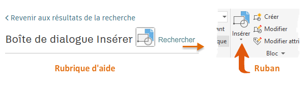 La fonction de recherche dans l'interface utilisateur a été ajoutée à la plupart des rubriques sur les boîtes de dialogue. La localisation de la commande associée à la boîte de dialogue dans l'interface utilisateur est ainsi plus rapide. Il vous suffit de cliquer sur l'icône de commande en haut d'une rubrique sur une boîte de dialogue dans le système d'aide afin de localiser la commande d'origine. Par exemple, vous pouvez rechercher l'emplacement de la commande INSERER à partir de la rubrique sur la boîte de dialogue Insérer.