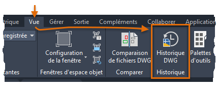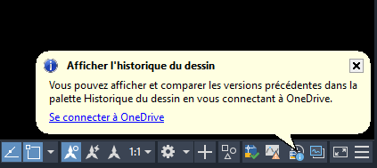 DWGHISTORIQUE : ouvre la palette Historique du dessin, qui affiche un historique des versions du dessin actif tel qu'il est géré par un fournisseur de stockage dans le cloud pris en charge.