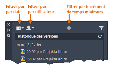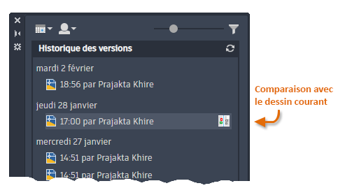 Lorsque vous vous connectez, la palette Historique du dessin s'affiche avec la liste des versions antérieures du dessin.