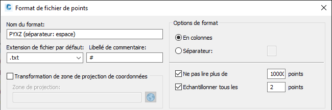 Figure 1 : Paramètres pour le filtrage du fichier de point