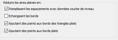 Si vous ajoutez simultanément toutes les données des courbes de niveau, utilisez les trois paramètres par défaut indiqués dans la figure 6 afin de modifier les courbes de niveau et créer une surface plus précise. Ces options d'Autodesk Civil 3D permettent de corriger les aires planes en vérifiant les altitudes voisines, en interpolant les nouveaux points et en subdivisant les triangles.