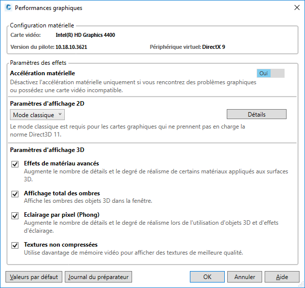Les paramètres des performances graphiques sont disponibles via la saisie de la commande AutoCAD CONFIGGRAPHIQUE. Cette opération affiche la boîte de dialogue Performances graphiques, comme illustré dans la figure 15.