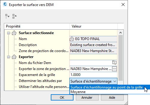 La méthode de détermination de l'altitude à chaque point est un paramètre d'exportation important. Vous pouvez choisir d'échantillonner l'altitude de la surface au niveau du point de la grille ou de calculer l'altitude moyenne à partir des points avoisinants. La deuxième méthode (établissement d'une moyenne) prend plus de temps. Pour plus d'efficacité, utilisez l'option d'échantillonnage de la surface, comme indiqué dans la figure 4.