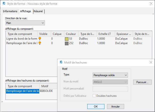 Pour la conception de projets 3D, vous pouvez créer des éléments de profil type de façon plus efficace en vous assurant que le style de forme de chaque élément est défini sans remplissage ou du moins avec un remplissage uni plutôt que des motifs de hachure. La figure 2 illustre la boîte de dialogue Style de forme dans laquelle vous pouvez définir un style de forme d'élément de profil type.