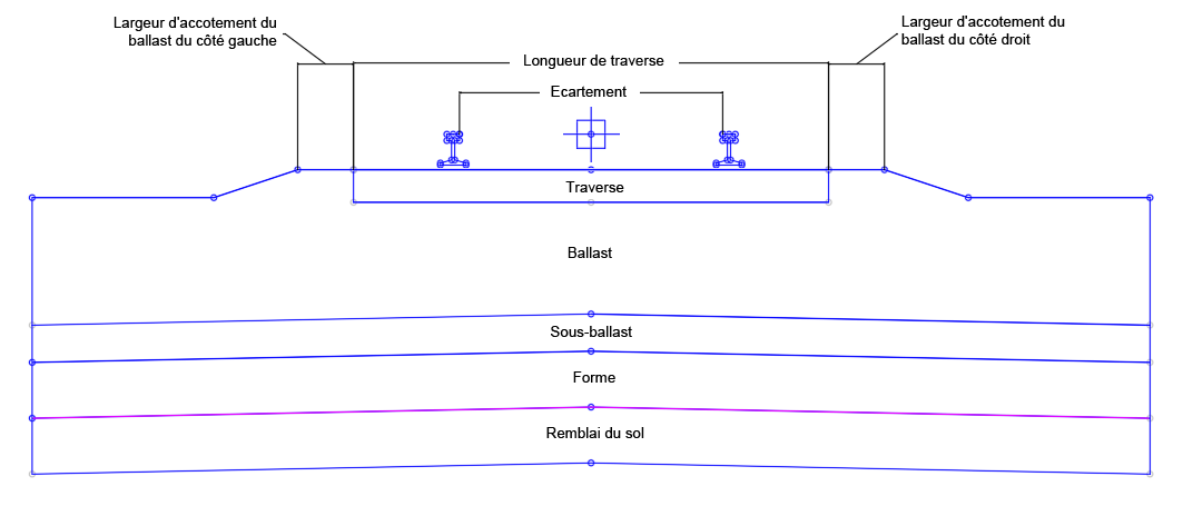 En mode d'édition, cet élément de profil type affiche les liens comprenant les rails, la traverse, le ballast, le sous-ballast et les pentes de talus.