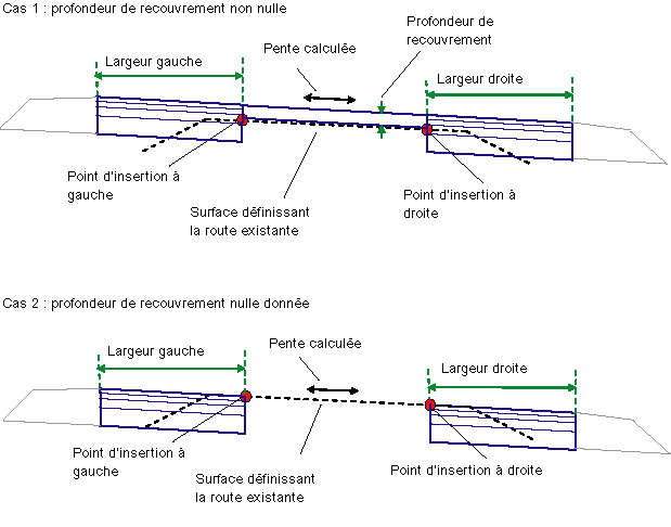 Les altitudes des points d'insertion à droite et à gauche sur la surface existante sont déterminées et la pente est calculée entre ces deux points. Si un paramètre Profondeur de recouvrement donné est non nul, une couche de recouvrement est ajoutée au-dessus de la voie existante sur la pente calculée. Une forme de recouvrement fermée est créée en superposant un ou plusieurs liens sur le talus existant. Les voies d'élargissement sont insérées vers l'extérieur à partir des bords de recouvrement pour les largeurs spécifiées sur la pente calculée.