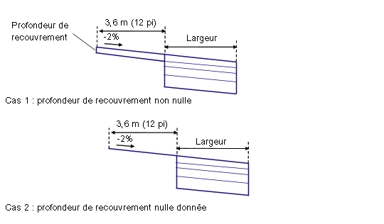 En mode d'édition, cet élément de profil type peut être associé à n'importe quel point. La couche de recouvrement présente une profondeur uniforme avec une largeur de 3.6 mètres ou 12 pieds et prolongée pour une pente à -2 %. Si le paramètre Profondeur de recouvrement est défini sur zéro, le recouvrement apparaît sous la forme d'un lien unique. La voie d'élargissement se prolonge du bord du recouvrement à une pente à -2 %.