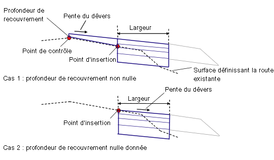 Si un paramètre Profondeur de recouvrement donné est non nul, la profondeur de recouvrement est appliquée au point de contrôle. Le haut de la couche de recouvrement est prolongé jusqu'au décalage du point d'insertion sur la pente de dévers et la forme de recouvrement est fermée en superposant des liens sur la surface existante entre les points de contrôle et d'insertion, ainsi qu'en ajoutant des liens verticaux à chaque extrémité. La voie d'élargissement est prolongée vers l'extérieur sur la pente de dévers pour la Largeur spécifiée à partir du bord de la surface de recouvrement.