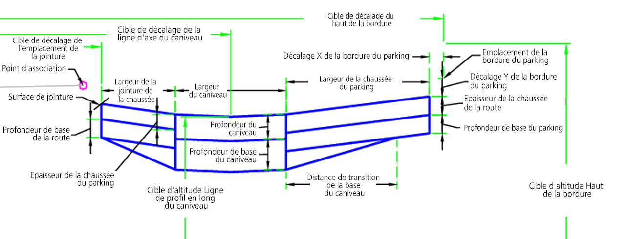 | Décalage du haut de la bordure | Permet de déterminer l'altitude du haut de la bordure au niveau du raccordement de la bordure du parking. Les types d'objet suivants peuvent être utilisés comme cibles pour indiquer l'altitude : lignes de profil, polylignes 3D, lignes caractéristiques du terrain ou figures de topographie. | Obligatoire |