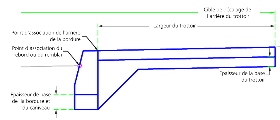 | Décalage de l'arrière du trottoir | Permet de remplacer le paramètre de largeur fixe du trottoir et de verrouiller le bord extérieur du trottoir sur un axe de décalage. Les types d'objet suivants peuvent être utilisés comme cibles pour indiquer la largeur : axes, polylignes, lignes caractéristiques du terrain ou figures de topographie. | Facultatif |