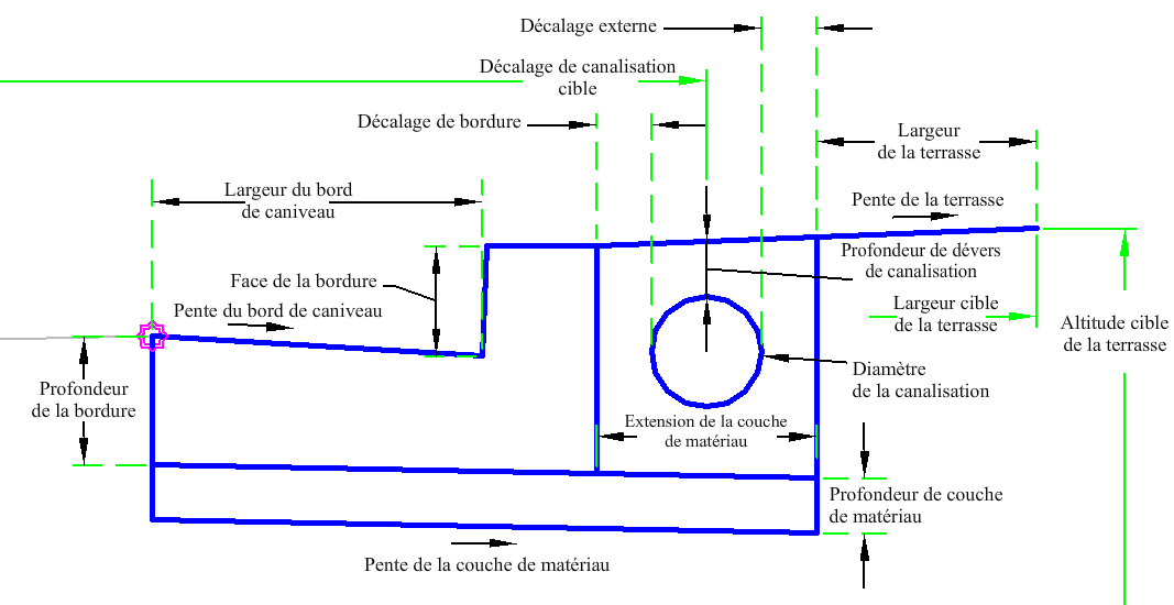 En mode d'édition, cet élément de profil type affiche les composants bordure et caniveau, canalisation et terrasse en fonction des paramètres d'entrée spécifiés.