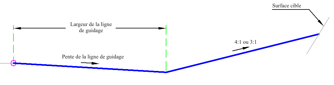 La ligne de guidage est dessinée à l'aide des paramètres d'entrée. La hauteur d'entrée en terre est ensuite calculée. Si la distance est inférieure à 25 pi (7,5 m), une pente d'entrée en terre de 4:1 est utilisée. Si la hauteur est inférieure à 35 pi (10.5 m), une pente d'entrée en terre de 3:1 est utilisée. Sinon, une pente d'entrée en terre de 2:1 est utilisée.